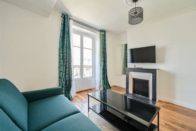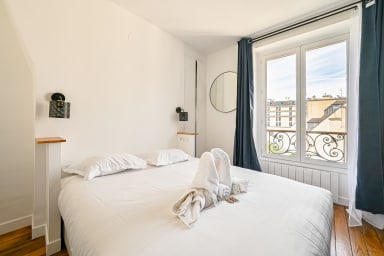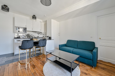 Charming renovated apartment in the heart of Paris. Bright living room, fully equipped kitchen, comfortable bedroom with queen-size bed, modern bathroom. Ideal for discovering the City of Light.