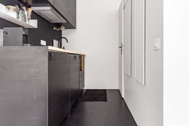 One of the highlights of the studio is its fully equipped kitchen, which opens onto the living area and allows you to easily prepare breakfast or meals while enjoying the natural light coming from the courtyard.